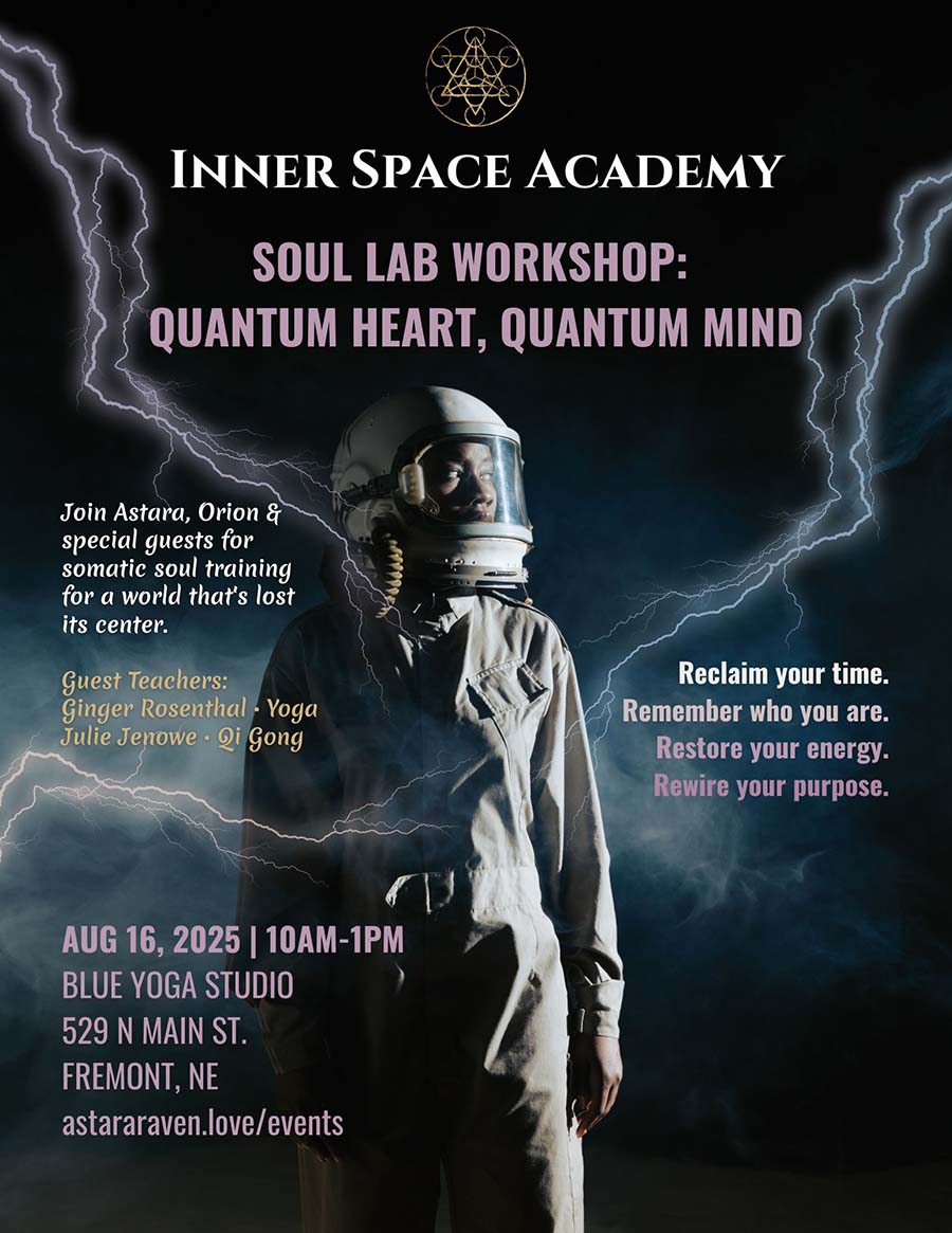 A 3-hour somatic soul lab retreat to align body, mind, and soul — your inner cosmos. This workshop is typically exclusive to Inner Space Academy, but we’re opening it up to YOU for a trial orbit pass if you’re ready to dip your toes in stardust. Join Astara Raven — quantum architect, professor of dreams, soul detective, and founder of Inner Space Academy — alongside Orion + special guest teachers Ginger Rosenthal (Yoga) and Julie Jenowe (Qi Gong) for a multidimensional experience of movement, stillness, and soul. Through guided meditation, gentle somatic practices, resonance medicine, Energy Codes and frequency-based teachings, you’ll: